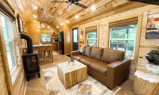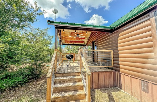 Charming log cabin nestled in the heart of Texas with lake access just a short stroll away. Rustic vibes of wood walls and ceilings. Backs up to corps of engineers land and next to boat ramp, outdoor adventures are at your doorstep. Enjoy the wooded backyard with a fire pit and grill, for relaxing evenings. Inside, you'll find modern appliances, smart tvs, WiFi, and a cozy wood-burning stove for chilly nights. Step out onto the large covered back patio to observe deer in their natural habitat.