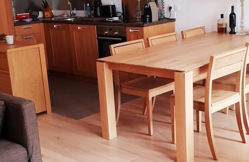 - A large living room with living room (TV - DVD player), dining room, fully equipped open kitchen (induction hob, extractor, dishwasher, oven, microwave, coffee maker, raclette machine, fondue, crêp'party…),