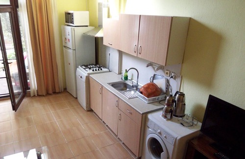 There is a kitchen equipped with a fridge, stovetop and kitchenware. Also there is a dishwasher, washing machine and stove in most of the flats.
