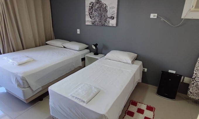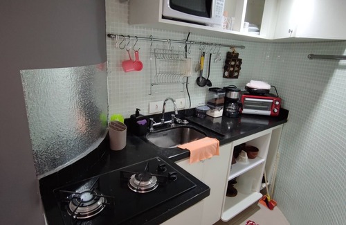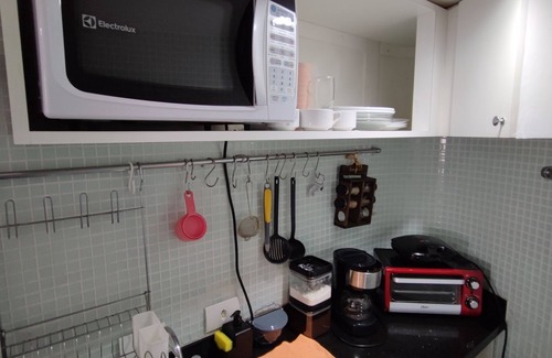 Não compartilhado com outros hóspedes, Flat de 40m2 com banheiro/Box ,Sala e quarto separados com paredes e porta , varandas em ambos é completo com mobília, Tv Smart com Netflix, Ar-condicionado. Cozinha com fogão e utensílios, panelas, frigobar, liquidificador, cafeteira, sanduicheira e micro-ondas para você preparar sua própria refeição. Tábua e ferro de passar. Secador de cabelo. Varal de pé para secar roupas. Ducha higiênica. Também tem serviço de quarto com arrumação diária feita pela camareira do condomínio. É fornecido roupas de cama: lençóis, fronhas, cobertas ou Edredons e toalhas de banho e travesseiros. Atendimento de recepção e garagem 24hs com recepcionista e com isso a partir das 14h00 pode chegar qualquer hora, inclusive depois da meia noite...