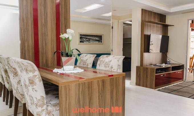 Possui dois quartos confortáveis. O primeiro conta com cama de casal, ar-condicionado, cortina blackout, roupa de cama, travesseiros e armário. O segundo tem uma cama de solteiro e uma beliche, também com armário, roupa de cama e boa ventilação natural. A sala é aconchegante, equipada com sofá, mesa de jantar, TV e uma iluminação agradável para momentos de descanso ou refeição.