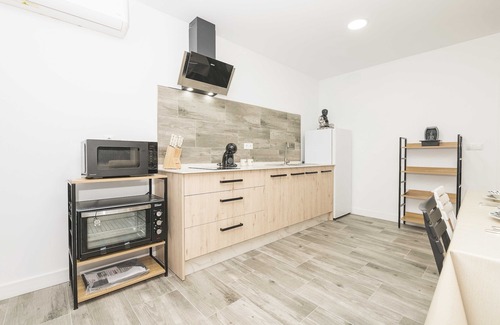 Inside, the flat offers an open-plan space that integrates kitchen, living room and dining room, designed to guarantee a functional stay. The kitchen is equipped with a ceramic hob and all the necessary utensils that will allow you to prepare your favourite dishes. The dining area has a main table to enjoy your meals and the living room has a double sofa bed and air conditioning, ideal for relaxing after a day at the beach. There is also a washing machine, tumble dryer, iron and ironing board. The bedroom has a comfortable double bed and has no windows. There is a bathroom with shower to complete the stay. Please note that there is no cot or highchair available.