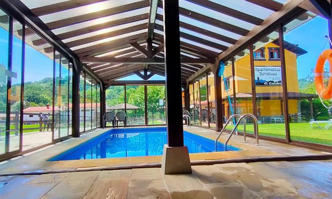 Offering river views, Apartamentos El Castañeu in Corao features accommodations, an indoor pool, an open-air bath, free bikes, a garden, and barbecue facilities. This property offers a pool with a view and free private parking. The apartment offers pool views, a sun terrace, a 24-hour front desk, and free Wifi is available throughout the property. The apartment provides guests with a patio, mountain views, a seating area, a flat-screen TV, a fully equipped kitchen with a microwave and a toaster, and a private bathroom with hot tub and a hair dryer. A fridge, a stovetop, and kitchenware are also featured, as well as a coffee machine. At the apartment complex, the units come with bed linen and towels. For guests with children, Apartamentos El Castañeu provides outdoor play equipment. If you like to discover the area, cycling, fishing and hiking are possible in the surroundings and the accommodation can arrange a car rental service. The Lakes of Covadonga is 13 miles from Apartamentos El Castañeu, while La Cueva de Tito Bustillo is 19 miles away. The nearest airport is Asturias Airport, 71 miles from the apartment.