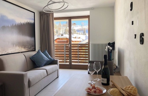 Apartment for 4 people with a double bedroom, living room with double sofa bed, equipped kitchen and bathroom with window and shower. It has a large balcony overlooking the village, woods and mountains and is located on the second floor (37m2).