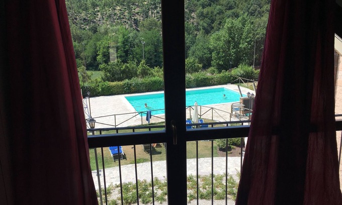 The apartment is located in the village of Piobbico in a residence with a total of 30 apartments spread over 5 rustic houses. You will have a shared swimming pool surrounded by a pretty garden. It is ideally located in the heart of the residence. with pleasant view of the swimming pool and Monte-Nerone.