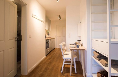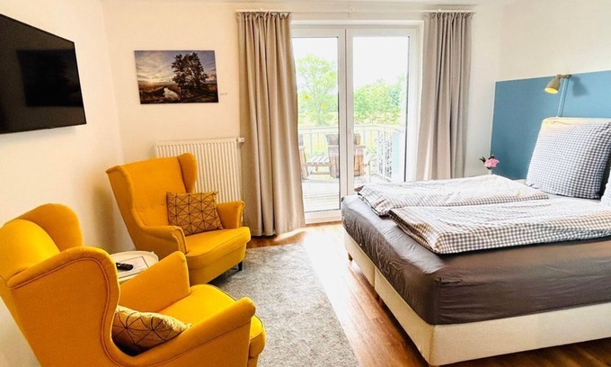 1-room apartment for up to 2 people on the 1st Upper floor with balcony: • Fully equipped kitchenette with dishwasher, mini-oven, and 2-plate ceramic hob • Box spring bed 160x200 cm • Sitting area with armchairs • Shower room with walk-in shower and underfloor heating