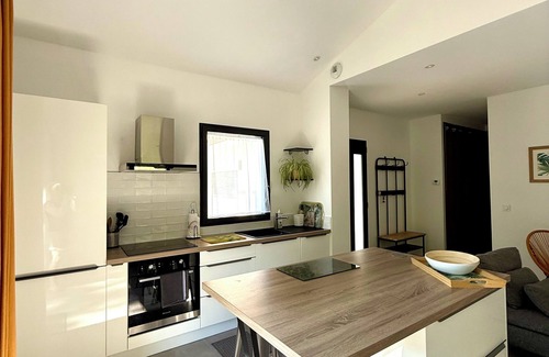 - 1 equipped open kitchen, with a central island : dishwasher, fridge-freezer, 3-burner induction hob, microwave, electric coffee maker + Nespresso, kettle, toaster, condiments, towels, cleaning products, USB socket