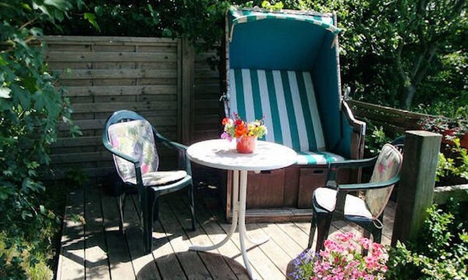 The cozy apartment comprises a combined living room / bedroom with double bed and kitchenette. There is a storage room as well as a terrace and a comfortable seating area in the garden with a beach chair.