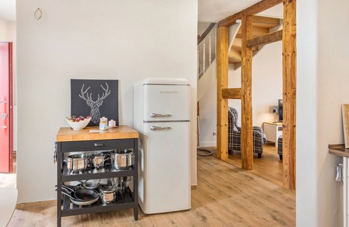 The Apartment 4 Putlitz in the quiet village of Helle/Prignitz offers 115 m² of space for up to 6 guests. The apartment is charmingly and stylishly furnished. You will find a cosy living area open to the kitchen. The first large bedroom has a comfortable double box spring bed and, if needed, space for a cot. The second bedroom is also equipped with a large double box spring bed and has a sofa that can be converted into a sofa bed. The kitchen is fully equipped. Wi-Fi is stable, free and suitable for video calls. Amenities include TV with video-on-demand, game console, baby bed, high chair and an uncovered terrace. The apartment offers various entertainment options and family-friendly facilities for your stay.