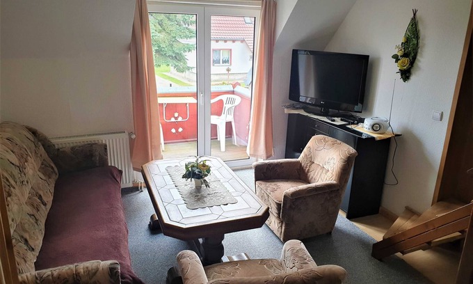 The apartment is located in the 1. Floor. The living room has a balcony and is on the sunny side. The mini kitchen is also located in the living room, is partitioned off with a partition wall and equipped with many kitchen appliances. Above the living room is a bedroom with 2 beds which can be reached via a staircase from the living room. The living room has a couch as an extra bed. The bedroom is located on the courtyard side overlooking the stork's nest on the barn roof. Both rooms are equipped with carpets. Bed linen inclusive, towels please bring. You / toilet tiled. Non smoking. Parking available. Terrace with sitting area is located on the property