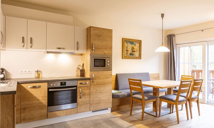 The open kitchen in the apartment is fully equipped: Cutlery and (cooking) dishes are available, a ceramic cooktop, oven, dishwasher, and a refrigerator with freezer compartment are part of the equipment, as well as a toaster, water kettle, and a Nespresso coffee machine. A small ALPS RESORTS starter set with dishwasher tabs, dishwashing liquid (sample), sponge, garbage bags, cleaning and dish towel is ready upon your arrival. WiFi is free, satellite TV.