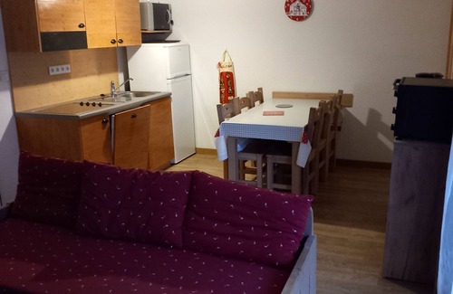 40 sqm apartment for 6 people with balcony facing south on the 1st floor without elevator. A mountain corner with 2 bunk beds. An alcove (separated by curtain) with 1 bed 2 people in 140. A living room with a pull-out sofa for 2 people, TV. A kitchen area equipped with 4 ceramic hobs, a fridge-freezer, a microwave and a dishwasher. A bathroom with bath, sink and separate WC. Parking at the foot of the residence. Private ski locker. The beds are equipped with duvets.