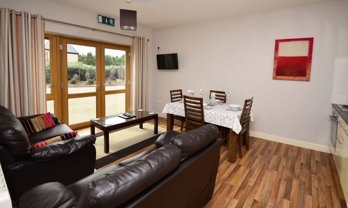 3 Bedrooms Sleeps 4. This ground floor self-catering apartment consists of a kitchen/dining/living room and WC. The kitchen has all modern conveniences including microwave, kettle, toaster, electric cooker with electric oven, washing machine and dryer. The living room area has comfortable seating, multi-channel TV, coffee table and double doors open out on to a courtyard area. The bedrooms consist of a double and 2 separate singles. The bedrooms all have wooden floors and furniture. The family bathroom includes bath with overhead shower. Electric heating throughout property. Ample parking on site. Electricity and heating on pay as you go meter. Linen and Towels Included. Hair dryer. High Speed Wi-Fi. No Pets. No smoking indoors. Caretaker and onsite office.