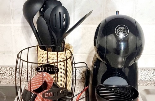 coffee machine with pods, moka pot, kettle, microwave, and cable TV.
