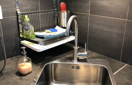 At your disposal: Vinegar, olive oil, salt, pepper, coffee pods, tea bags, dishwasher tablets, washing machine tablets, dish washing, sponge, dishcloth, shower gel, shampoo, toilet paper.
