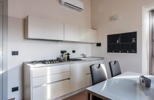 The apartments are equipped with independent air conditioning and heating, bathroom with shower and crystal box, Smart TV, Sky TV with free view of all the programming offered, fully equipped kitchen of every household appliance (dishwasher, oven, micowave, kettle, moka and automatic Nespresso machine with included pods, toaster, fridge, freezer), fiber optic Wi-Fi, washing machine, iron, ironing board and drying rack, hairdryer, safe.