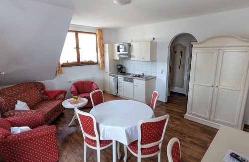 Small wellness area with sauna, steam sauna, Fußwärmebecken and relaxation room, free of charge at certain times. Fitness room with power station. Breakfast or HB, on request in the hotel "Zum Sonnenhof" 100 meters away, possible.