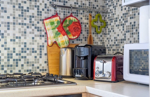 Suitable for families, the kitchen is equipped with microwave oven, kettle, espresso machine with pods, toaster, refrigerator and kitchen accessories.