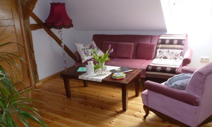 The clay cottage still has its old outer walls and the original walls inside. The thick walls provide cool rooms in summer and cozy warmth in winter - a natural air conditioning system that is still used today. Your AusZeit home is located on the second floor.