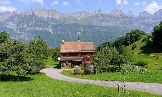 Oberterzen: Enjoy a holiday comfortable surrounded by rabbits, chickens, cats and dogs. Child friendly working farm "Gubser", 630 m a.s.l., surrounded by meadows. On the outskirts, in a secluded, quiet, sunny position on a slope, 3 km from the lake, 300 m from the skiing area, in the countryside. For shared use: garden. Patio, terrace. In the house: lounge, table tennis, playroom, table football, sun terrace, storage room for skis, central heating system. Motor access to the house. In Winter: please take snow chains. Stepped path (15 steps) to the house. Parking at the house. Grocery, restaurant 200 m, bus stop 200 m, railway station "Unterterzen" 3 km, outdoor swimming pool 3 km, bathing lake "Walensee" 3 km. Mountain railway, skisport facilities, ski school 300 m. Well-known ski regions can easily be reached: Flumserberg 300 m. Well-known lakes can easily be reached: Walensee 3 km. Hiking paths: Flumserberg. Please note: In case of good snow conditions, the house is accessible on skis. The owner lives on the same property. Animals in the neighbourhood.