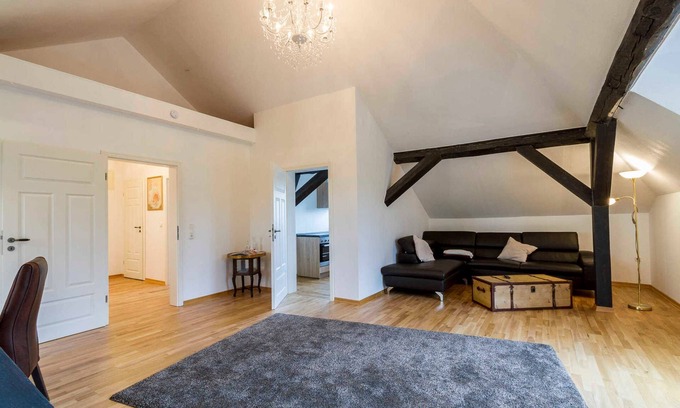 Apartment "Sonnenschein": 80 m², 2 bedrooms with box spring beds, for up to 4 persons, both bedrooms are equipped with TV, a nice bathroom, a kitchen and a large living room (45 m²) with a roof up to the ceiling.