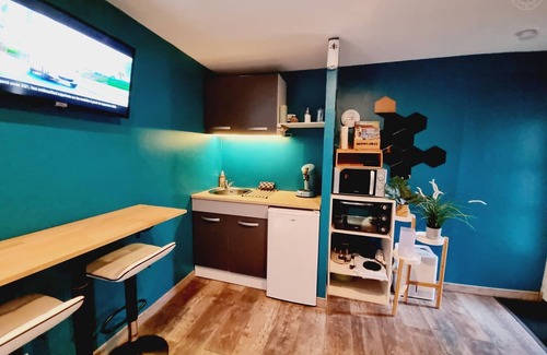 50m² gîte located in a dead end street and adjoining another gîte. Ground floor with kitchen area (2-burner electric hob, mini-oven, microwave, Senséo coffee maker). No washing machine.