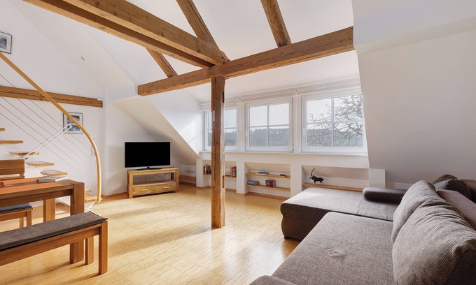 Far away from noisy cars, trains and planes, you can relax here, chill out in the large garden, hike, cycle or go on excursions in the surrounding area. You enter the approx. 70 sqm apartment, located on the 2nd floor, via your own entrance. From the hallway you enter the spacious, light-flooded bathroom and the fully equipped kitchen with serving hatch to the dining table for four people. The large, bright living room has a sofa bed (queen-size bed) for 2 people, hi-fi, TV and furniture to store your vacation equipment. A staircase leads to the gallery to your sleeping area with a comfortable double bed.