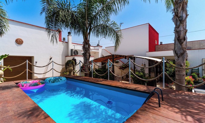 Beautiful house formed by a newly built apartment, away from the city chaos and located 8 km from the sea of Otranto, Porto Badisco, and a few km from the sea of Gallipoli. The property is conveniently located 10 km from Castro and Santa Cesarea and just 2 km away from the botanical garden. The apartment is equipped with all comforts such as air conditioning, washing machine ,ironing board, safe, TV, and ample parking. In addition, the 'apartment is located near the largest botanical garden in Europe 'CUTURA GRANDE' and a few km from the international go Kart track 'LA CONCA'. Casa Vacanza Aurora is a beautiful apartment consisting of 2 bedrooms, 1 bathroom, a kitchen and a fantastic garden with a beautiful pool, outdoor shower and a large barbecue to use in the wonderful evenings of 'summer. Small pets only.