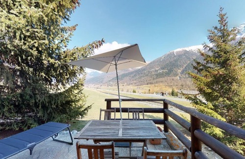 The apartment features one bedroom with a double bed and a small bedroom with a bunk bed, making it suitable for couples or families with young children. The master bedroom has access to the terrace, which is furnished with garden furniture and a sun umbrella. A bathroom with a shower is available, along with a fully equipped kitchen with a combi steamer. The living room invites you to relax with its sofa, TV, dining table, and fireplace. Wi-Fi and Swisscom TV are included. A garage parking space can be rented for an additional fee and is located nearby.