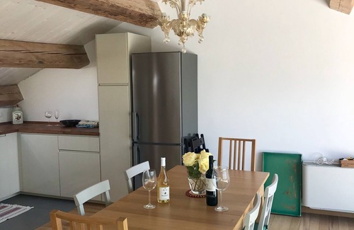 The apartment (102sqm + 30sqm terrace) is located on the first floor of a charming country house. The building, of the late '800, has just been completely renovated with fine finishes, including parquet throughout the house (bathrooms not included). Access to Dora is independent. On the first floor there is a large entrance hall with a fireplace and comfortable armchairs; a hallway that gives on two double bedrooms and two bathrooms, both with a shower and one with a double sink. The second floor is a beautiful penthouse with open kitchen, dining area and living area with sofa and TV, plus an extra sofa bed (160x200) for 2 people. Complete the attic a beautiful 30 sqm terrace, equipped with a gazebo, table and chairs, where you can eat or simply relax in the sun. Air conditioning, free wi-fi.