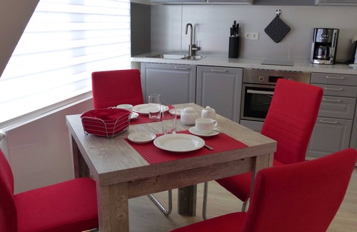 Arrive and feel good. On a surface of 60sqm awaits you a newly renovated apartment with high-end equipment in country house style and a generously developed ceiling area with exposed roof beams. The apartment Elbzeit is located on the first floor with a separate entrance. The 20sqm bedroom with a double bed 180x200 invites you to a good night's sleep. The integrated in the living room, fully equipped kitchenette leaves nothing to be desired. Induction hob, multi-function oven with integrated microwave, refrigerator with freezer, dishwasher, extractor hood are of course available. A TV flat screen, as well as a radio with CD, provide entertainment. The existing Wi-Fi connection can be used free of charge. Furthermore, the facilities include a shower room with floor-level shower, hair dryer, towel warmer and make-up mirror. The toilet is separate. Enjoy the sunrise and sunset on the balcony to the east or to the southwest side. The apartment has a parking space directly at the house. For bicycles brought a lockable bicycle shed is available. Bedding. Towels, kitchen towels are available in the apartment.