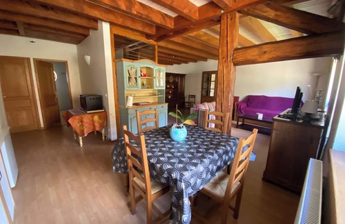 The Entre Lacs et Sapins vacation apartment is located on the heights of Dortan, with a magnificent view of the neighboring mountains. A large 65 m² room comprises a living room, a fully-equipped kitchen and a sleeping area. A bathroom with double washbasin and separate toilet. The property can accommodate up to six people. Additional facilities include Wi-Fi with a dedicated teleworking area, a TV with books and games for young and old.