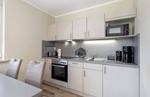 The apartment has a size of approx. 45 square meters and is suitable for up to 4 people + baby crib if required. The eat-in kitchen on the first floor is fully equipped incl. Smart TV. There is a double bed in one bedroom and two single beds and a Smart TV in the second bedroom. Bed linen and towel package are included. Fly screens are fitted to all windows. Underfloor heating in all rooms. The bathroom has a WC and shower with rain shower, as well as a hairdryer.