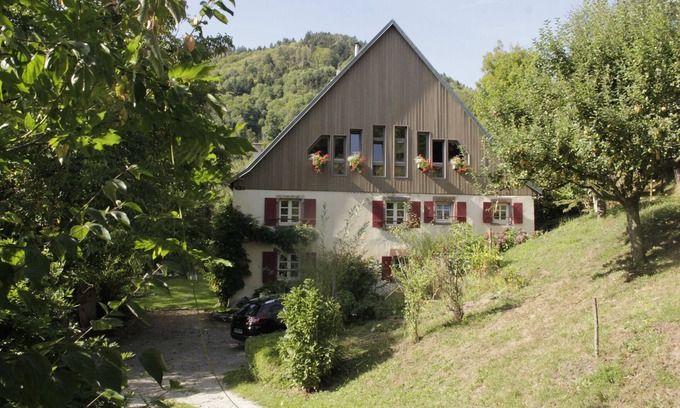 (Text automatically translated) This beautiful house is set in the "home" of an old mountain farm, overlooking a green setting remarkable, the Plain of Alsace. Ceilings with beautiful trusses, floors Vosges fir and tiled stove will delight you. The potter's workshop is located on the ground floor: you will turn the sandstone Alsace and shimmering glazes. This property enjoys a very sunny and tranquil location is disturbed only by the sound of the fountain. It is not uncommon to catch a deer and even a deer in the property ... Come winter, you will get 170 lifts and 1000 km of ski slopes covering the Vosges. We invite you to come discover this little paradise weekend during the Christmas markets.
