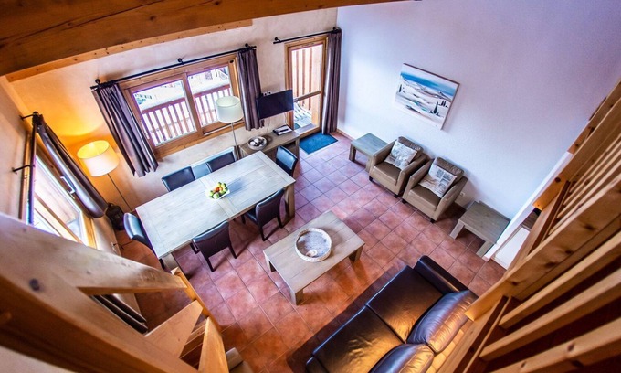 The six-person apartments have two bedrooms with box-spring beds, of which one is the mezzanine measuring 16 m², with daylight and a stunning view. There is a comfortable sofa bed in the living room which is suitable as a place to sleep for two persons. It goes without saying that a television set is present, with various channels available via satellite. The bathroom has a bathtub or a shower, and you will find a separate toilet. The kitchen has every convenience, including an oven, a microwave, a dishwasher, a refrigerator with a deep freezer compartment, as well as a four-ring cooking hob. In the living room, you can enjoy the view and walk right onto your terrace or balcony. There is a separate place at the central building for safe storage of your skis.