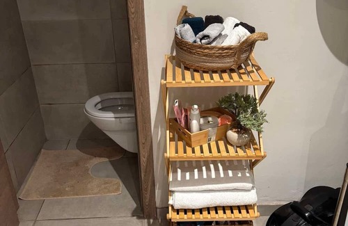 While you're here, you can enjoy all the comforts of home and more, including a jetted bathtub and WiFi, as well as a bidet and air conditioning. Other amenities include laundry facilities, towels, an ironing board, and soap.