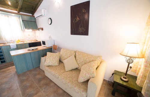 Located in Corfu, the holiday apartment Frini One-Bedroom Bungalow has everything you need for a comfortable holiday. The 29 m² property consists of a living room with a sofa bed for one person, a kitchen, 1 bedroom and 1 bathroom as well as an additional toilet and can therefore accommodate 3 people. Additional amenities include high-speed Wi-Fi (suitable for video calls), a TV, air conditioning as well as a washing machine. A baby cot and a high chair are also available. This property features a private garden, barbecue, and outdoor shower.