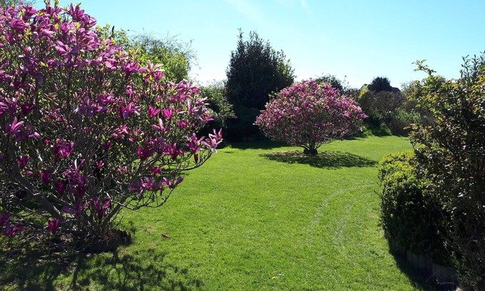 Our comfortably furnished apartment is 75 square meters and has a large balcony facing south. From noon until sunset, you can enjoy the sun with a view of the peaceful garden. Our apartment is located on the 1st Floor and consists of a large bright living room, equipped with sitting area, coffee table, flat screen TV and stereo, a kitchen with dining area, the u. a. equipped with dishwasher, microwave and oven. In addition, there are 2 bedrooms (one large room with double bed, desk and flat screen TV and a small room with 2 single beds), shower / WC, W-Lan and cable TV. Cot, highchair etc. on request. Bed linen, towels and final cleaning are included in the price. The sanitary facilities include toilet and shower.