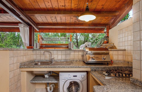 The holiday apartment boasts a private outdoor area with a garden, garden furniture, a covered terrace, a barbecue and an outdoor shower.
