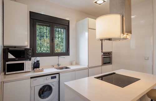 Located in the heart of Nervión near Gran Plaza in Seville, this bright 80 sqm apartment welcomes up to 6 guests across 3 bedrooms. You will find one bedroom with a 150 cm x 200 cm memory foam double bed, one bedroom with 2 single beds, and one bedroom with a single bed plus trundle bed. Each bedroom includes a wardrobe and the apartment features a shared fully-equipped kitchen with an island. Amenities include private Wi-Fi, TV with video on demand, washing machine, dryer, and dedicated workspace. The apartment has comfortable parquet flooring, high-quality materials and decor, and double-glazed windows throughout.