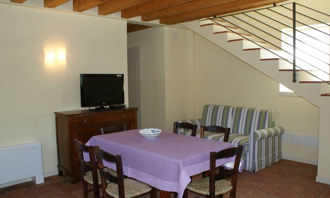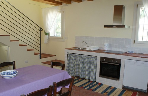 On ground floor and on the first floor, it is composed: at ground floor a living room with kitchen area, double bedroom and one bathroom for disables with shower; at first floor two double bedrooms, one bathroom with shower. Living room: kitchen area with double sink, 4 ring induction , electric oven, dishwasher, tableware and cookware for 8 people, complete with square dining table which extends for 8people, chairs, double sofa bed (120 cm mattress), TV armoire. Double bedroom: spacious with twin beds, which can be joined together on request, 2 bedside tables, two-door wardrobe, desk with DSL jack and TV socket, chairs. Shower room: basin, toilet, bidet, decorative radiator, shower, hair dryer.