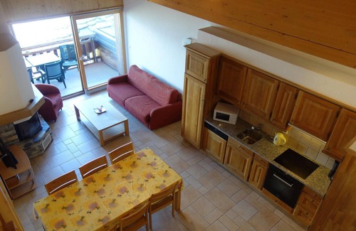 Welcome to a cozy mountain apartment situated in the heart of Veysonnaz, Switzerland, accommodating up to 8 guests. This charming 3-room flat is located on the fifth floor and boasts breathtaking views of the Rhône Valley and surrounding mountains. The bright living room features a double sofa bed, a welcoming fireplace, cable TV, a DVD player, and a Hi-Fi system, all opening onto a balcony that enhances your alpine experience. The open kitchen is fully equipped with a fridge, oven, microwave, toaster, filter coffee machine, kettle, and dishwasher, ensuring all your culinary needs are met. Sleeping arrangements include Bedroom 1 with two single beds (90x200) and an en-suite bathroom with a shower and toilet, along with two additional bedrooms, each with two single beds (90x200). A mezzanine offers a cozy reading corner and additional balcony space, while a separate bathroom features a bath and toilet. Enjoy the convenience of a laundry room (digital payment), a ski room, and one indoor parking space included with your stay. Please note that pets are not accepted, and access is via lift or stairs. The Plein Ciel residence places you just 270 meters from the cable car, shops, and leisure activities, making it an ideal location for your vacation. Extra costs include a tourist tax and a security deposit, while optional services like bed linen, towels, final cleaning, and comfort packages are available. Benefit from free access to the public swimming pool, participation in the Sun&Fun activity program during summer, and discounts on equipment rentals. Welcome to your alpine getaway!