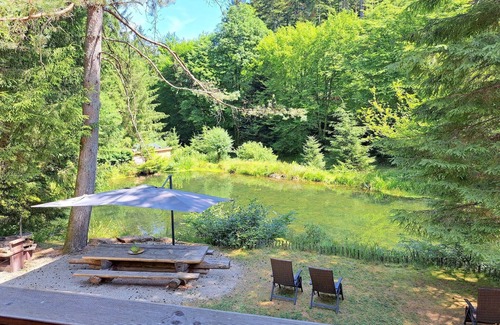 A true paradise for nature lovers! Your apartment is on the upper floor of a residential building consisting of 3 holiday apartments, which is located with the house of the German owners on a 40,000 square meter natural site. You have a private terrace area and free access to the entire property. Enjoy crystal clear water, a unique flora and fauna and at night the impressive starry sky. Far from the stress of everyday life and without TV, you can go fishing, fly fishing, picking mushrooms, work out on a mountain bike or go for a leisurely bike ride and extensive hike. The evenings are spent here socially with barbecues, often with self-caught trout. However, guests can also spend the evening in peace and quiet and listen to the sounds of nature. If your dog is "socially compatible", he will enjoy having fun with the owners' two dogs on this huge playground. Nature always has the last word here. Incidentally, the electricity in your holiday apartment is generated by the power of the stream.