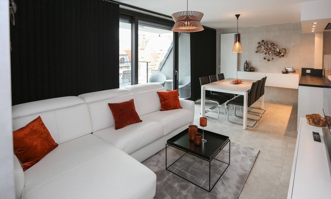 Stylish Comfort with Expansive Outdoor Space Experience elevated coastal living in this elegant 4th-floor apartment, designed with attention to detail and comfort. The highlight is the oversized sun-soaked terrace (3.5m x 7.5m), perfect for relaxing mornings and evening drinks. Outfitted with a bar table, lounge set, and cushioned seating, it's an ideal spot to soak in the breeze. Inside, enjoy plush furnishings including a cozy sofa bed with a mattress topper, digital TV with sound bar, electric blinds, and a fully equipped modern kitchen with both a coffee machine and Dolce Gusto for your morning rituals. Central Location with Seamless Access Centrally located in Middelkerke, everything you need is at your doorstep — from the beach and Casino to boutique shops and bakeries. The apartment includes a private garage space (Casino Parking #281), making exploring nearby towns like Nieuwpoort, Ostend, or even Bruges a breeze. With easy access to public transport, golf courses, and walking trails, your days can be as laid-back or active as you wish. Dining Delights Around Every Corner Middelkerke offers a diverse culinary scene just steps away. Indulge in fresh seafood at beachside brasseries, grab frites at a local stall, or enjoy a romantic dinner at one of the many cozy restaurants along the promenade. After dining, return to your peaceful haven—note: pets are not allowed, ensuring a serene and allergen-free stay for all guests.