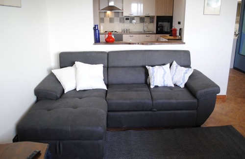 The well-equipped kitchen includes an oven, microwave, dishwasher, fridge-freezer, and two coffee machines, ideal for preparing meals after a day of exploring. Step out onto one of the two balconies or unwind in the large shared garden (500 m²) with sun loungers, barbecue, and panoramic views.