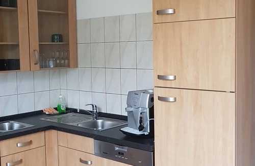 large apartment with good facilities in Fürstenwalde. 1 bedroom with double bed, 1 living room with sofa bed for 2 people. Another guest bed available. Baby cot available.