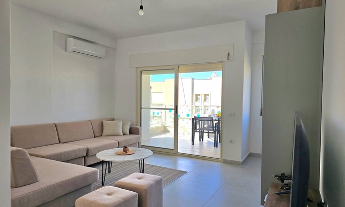 Modern apartment with 2 bedrooms accommodating up to 6 guests, offering 90 m² of comfortable living space. The property features a balcony, air conditioning throughout, heat pump, Wi-Fi, washing machine, iron, hairdryer, and one TV. Open-air parking is available in the adjoining building. This family-friendly home is perfect for a relaxing stay by the sea. Located just steps from essential amenities, it is 10 m from a supermarket, 20 m from a coffee shop, and within 400 m of several cafes, restaurants, and sandy beaches including Il Gambero and Elements Beach. The property is 38 km from Tirana International Airport, making travel convenient and easy for visitors. The open-plan kitchen is fully equipped with a ceramic hotplate, refrigerator, microwave, oven, freezer, dishwasher, coffee machine, kettle, and all necessary kitchenware. This ensures guests can prepare meals with ease while enjoying modern conveniences in a bright, welcoming environment.