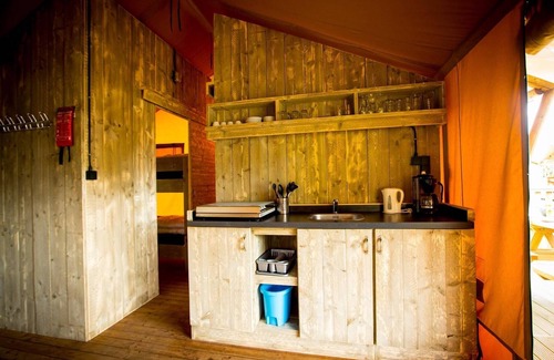 Nestled in the heart of Udenhout, these lodges offer quick access to nature reserves and walking paths. With three bedrooms—one with a double bed, one with a double box bed, and another with a single and bunk—these tent lodges comfortably host families or small groups. Step outside onto your private covered veranda with garden furniture and breathe in the forest air. Located near several playgrounds, kids have space to play while adults unwind in comfort. Please note: pets are not allowed, ensuring a clean and allergy-friendly environment.