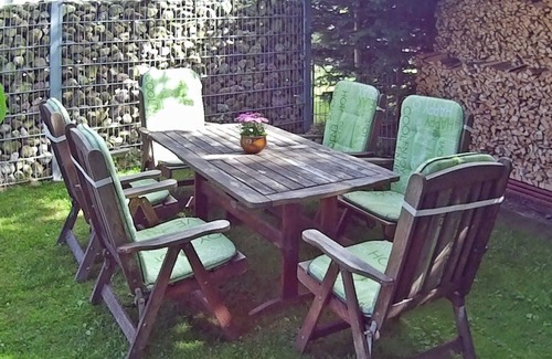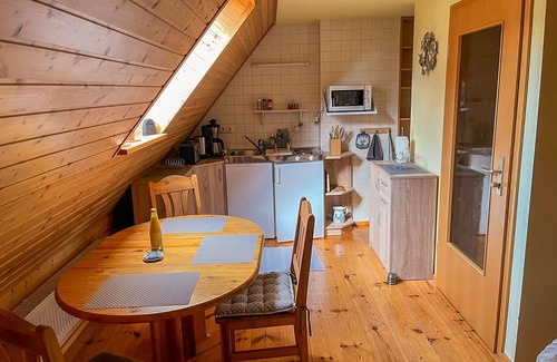 The 70 square meters apartment is located in a central location in the village of Niepars. It is located in separate building and can accommodate 2 people. An extra bed for an adult or a child on a double bed possible. A cot is available. It is a complete children's range with highchair, table and 2 chairs, children's toilet seat, potty, bar stools für' s sink, tricycle, bicycle, roller wheel, cars and sandpit. The apartment is upstairs of a cozy living room with kitchen and sleeping area. The kitchen is equipped with a refrigerator, freezer option, microwave and a pizza oven. The bathroom with shower and toilet on the ground floor. Also use the exercise equipment as treadmill, trampoline, ellipticals, Stairmaster and Sit Up Bank Bauchtrainer ready for free use. A parking space is on the property free of charge. Weather permitting, the seating area invites you to linger or a BBQ. For bicycles there are storage facilities. A bicycle rental is available in Niepars, the apartment is thus very well suited for bicycle tourists to explore the area around Stralsund and Darß.