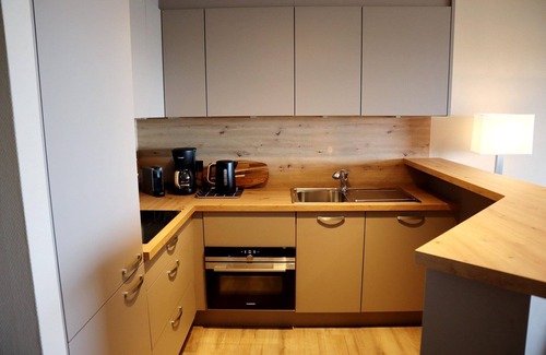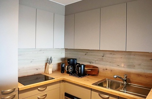Layout: On the 1st floor: (open kitchen(cooker(induction), coffee machine, oven, microwave, dishwasher, fridge-freezer), Living/diningroom(TV(digital), dining table, seating area), bedroom(double bed(160 x 200 cm)), bedroom(bunk bed), sleeping niche(bunk bed), bathroom(bathtub with shower, washbasin, toilet), toilet(toilet)) garage(on the same premises), balcony or terrace, bicycle storage(shared with other guests), lift